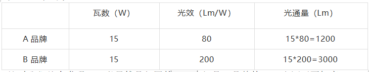 同樣為15W的LED光源。A品牌光源光效為80Lm/W,而B品牌光源光效為200Lm/W,光通量對(duì)比為: