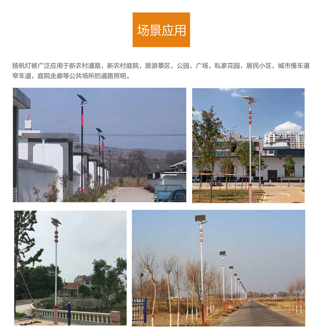 揚帆燈作為一體化太陽能路燈,被廣泛應用于新農村道路、旅游景區、公園、廣場、居民小區、城市慢車道/窄車道等場景。